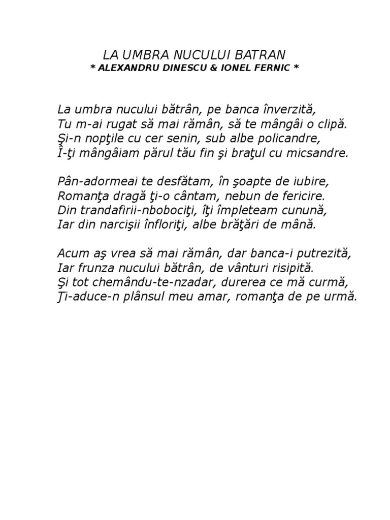 La umbra nucului batran nucul acest nobil dintre copaci care te hraneste cu fructele lui si te fereste de arsita in zilele toride. Romanta draga ti o cantam nebun de fericire din trandafirii mbobociti. Bunicul meu a plantat acest nuc langa casa tocmai pentru a i simtii vibratia si binefacerea parintii mei au ales locul casei dupa forma si pozitia unui nuc batran iar acesta i a rasplatit cu racoare si fructe din belsug. 07 08 silviu ionuţ avram la umbra crucii tale priceasnă video.